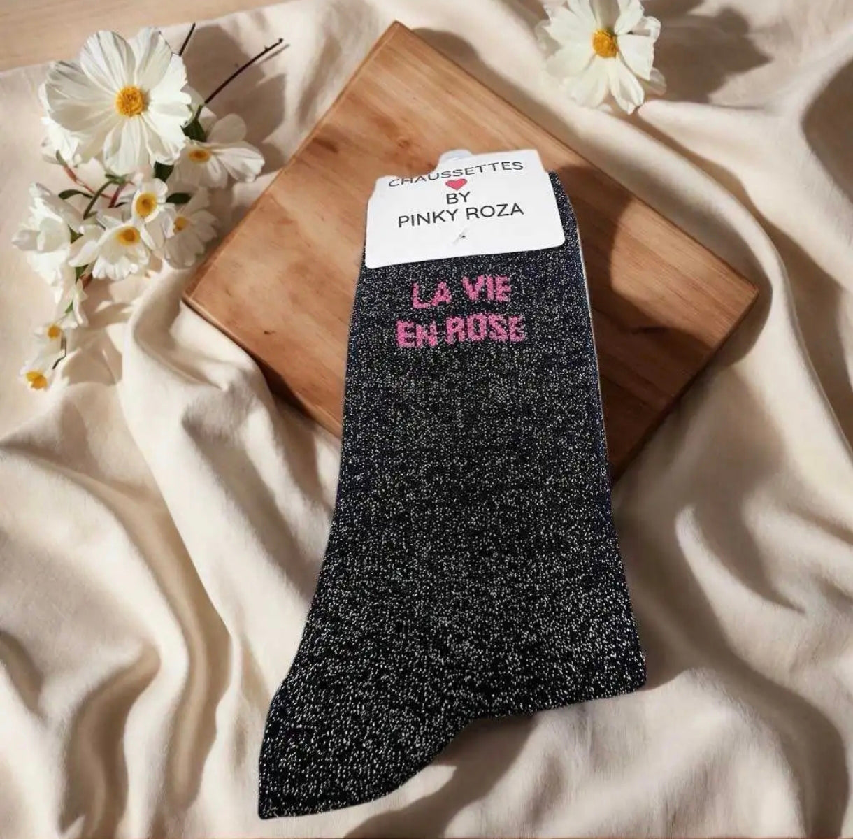 Affichez votre soutien avec style grâce à notre coffret exclusif Octobre Rose. Chaque coffret contient une paire de chaussettes pailletées au choix – noires ou champagne – ornées de l’inscription « La vie en rose », symbole d’espoir et de force.